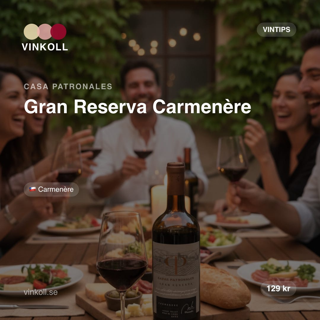 Vinet jag tar med är Casas Patronales Gran Reserva Carmenère. Producenten har jobbat med Carmenère sedan 1990 och har 30 hektar i Cauquenes. Vinet lagras på fransk och amerikansk ek tillräckligt för att ge en ton av kakao och vanilj i bakgrunden, inte så mycket att träet tar över.